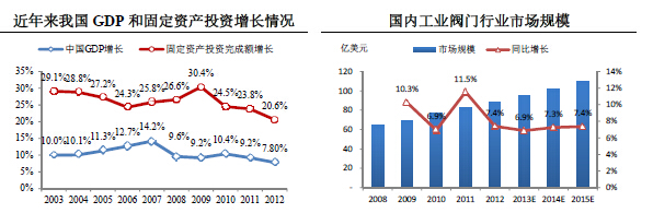 2003年-2012年,中國經(jīng)濟總體上保持快速增長(cháng)的發(fā)展態(tài)勢,平均GDP增長(cháng)率為10.45%,全社會(huì )固定資產(chǎn)投資完成額增長(cháng)率平均為26.11%。國內閥門(mén)行業(yè)整體上保持持續增長(cháng)的態(tài)勢,景氣程度高于全球水平。2008年全球金融危機爆發(fā)后,國內閥門(mén)行業(yè)增速下滑,但在2010年又恢復到較高的增長(cháng)水平。根據McIlvaine的分析,預計2013年至2015年,中國工業(yè)閥門(mén)行業(yè)市場(chǎng)規模的增長(cháng)率還將穩定在7%左右,遠高于全球的工業(yè)閥門(mén)行業(yè)增長(cháng)速度。